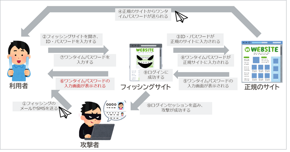 - 攻撃者がフィッシングサイトから取得したワンタイムパスワードを即座に正規のサイトへ入力する。